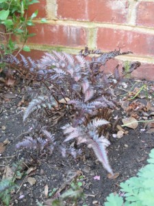 This Japanese painted fern comes up purple each year but changes to silvery gray with a purple tinge after a few weeks.