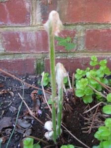 The cinnamon fern has just pushed through the ground with its furry fiddleheads.