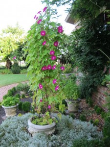 New to my garden this year were morning glories. Started from seed, they have been growing steadily throughout the summer, and now finally producing flowers. Their exuberance is overwhelming and they are about to climb into the wisteria that is certainly not a shy neighbor.