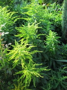 Another goldenrod, ‘Fireworks’, blooms much later but its long bud bearing stems provide an airy background for the black eyed Susans and lantana that grow in front of it.