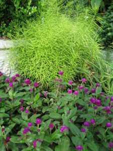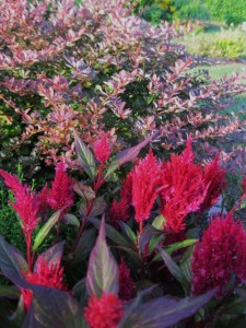 Another barberry, ‘Crimson Pigmy’ brightens forms a nice backdrop for crimson red celosia.