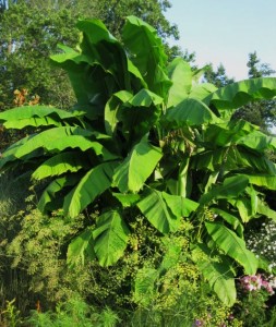 The hardy banana plant is looking as though it has been in the garden for years but all the growth that you see is from this year! We cut it way back each fall and cover it with leaves. In spring it begins growth as soon as it is uncovered and here is the result. The most delicate plant in the garden, fennel, is growing with the coarsest; quite a contrast.