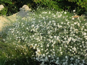 The blooming of the boltonia signals me that fall is near. I love the white flowers with the white of the stone bench.