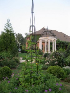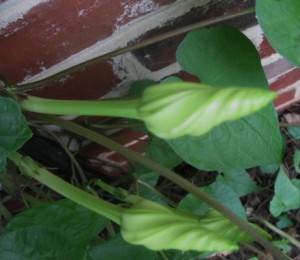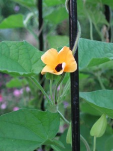 Now that my moonvine has struck its stride I am watching my black eyed Susan vines in the large container in the middle of the formal garden.