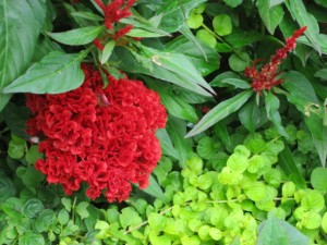 The celosia love the hot weather and are looking grand. The creeping jenny at the feet of the scarlet brain celosia really makes the colors pop.