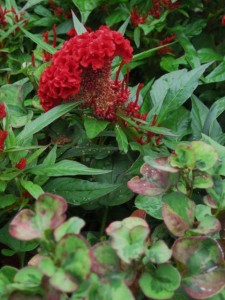 Elsewhere the red of the celosia is echoed by the red in houttuynia ‘Chameleon’.