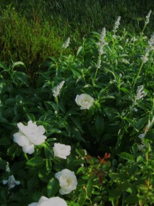 White Salvia farninacea and a white patio rose bloom in front of one of the boltonias.