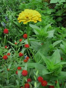 The yellow zinnias and red Geomphrena ‘Strawberryfields’ are a contrast in color, form, textures, and size.