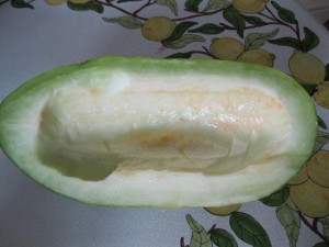 The inside looks a bit like a honeydew and tastes like an unripened honeydew with a cucumber twist.