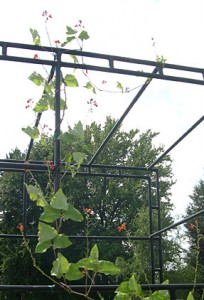 Climbing the arbor that was set up for roses is scarlet bean (Phaseolus coccineus ).
