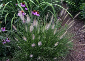Dwarf fountain grass adds a bit of airiness while providing a spike-like flowers head.