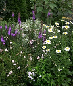 The tall lavender spikes of Gayfeather (Liatris spicata ‘Kobold’) provide a complementary background for the simple white and yellow flowers of this Shasta daisy (Chrysanthemum x superbum ‘Becky’).