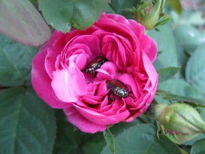 The rose garden itself is quiet. I have been deadheading as the flowers fade and very few bushes are blooming which is probably a good thing as I spotted the first Japanese beetle in a blossom of Rose de la Rescht, an old garden rose.