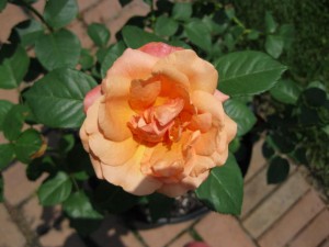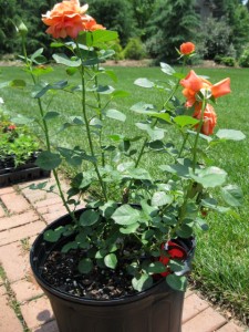 On the Saturday road trip with the local rose society I could not resist buying a new rose to fill a hole that developed in the rose garden when I had to remove a rose that developed rose rosette I choose a peach-orange blend floribunda, ‘Easy Does It’.