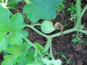 One volunteer acorn squash has produced a fruit. It has a long way to go but hopefully is a sign of good things to come.