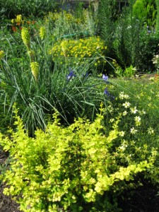 The yellow border continues to show color with torch lilies, coreopsis ‘Moonbeam’, and berberis providing lemon yellow and balloon flower adding a touch of blue.