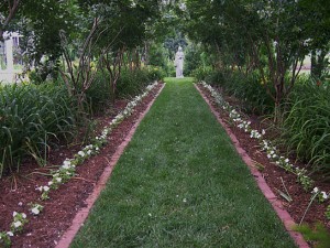 The white crape myrtles, (Lagerstroemia indica ‘Natchez’) in the allee next to the house came into bloom just as I was setting out the long rows of white impatients.