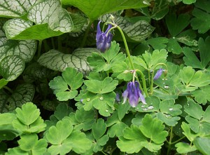 This little columbine (Aquiliegia flabellate ‘nan’) made a repeat flowering, much to my surprise. The white of the leaves of Siberian Bugloss (Brunnera macrophylla ‘Jack Frost’) accents the white in the flowers of the columbine and the similar shape of both creates an interesting echo.