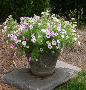 This is the cheapest, easiest container I have ever had. All of these petunias are volunteers from last year. The pot was originally planted with purple grass, pale lavender petunias, and purple gomphrena. The winter killed them all but the petunia seed which sprouted and this was the result. Not bad for no work at all!