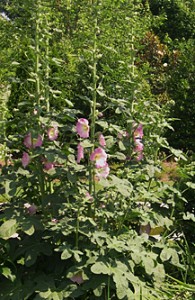 In the formal garden, the hollyhocks have begun to bloom. These pink ones are the single old-fashioned kind.