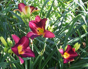 Some of the daylilies on the outer edge are making a spectacular show. Unfortunately, I have no names for any of the daylilies as they were all cast-offs from a friend of friend. The bright yellow eye of this one is a lovely contrast to the dark, purple red of the petals.