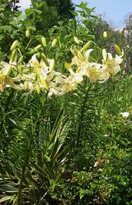 White lilies (Lilium speciousum album) bloom with their recurved petals and brown spots that I love so well. The color of the lilies is picked by the yucca (Y. gloriosa ‘Variegata’) next to it.
