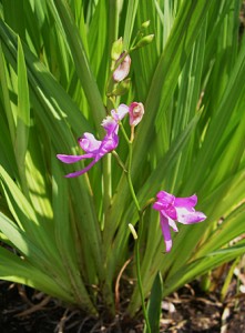 In the bog garden, the frail but vibrant bog orchid put forth its blooms.