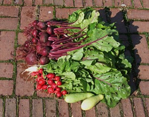 We harvested our second crop of radishes, including some white ones, and our first crop of beets (about 24) , our first summer squash, and first zucchini.