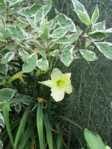 This little charmer from my garden in Annapolis is set in front of variegated Cornus ‘Elegantissima’ and peaks out from under bronze fennel.