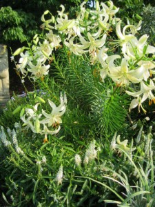 The creamy white tiger lily, ‘Sweet Surrender’, grows in the white border with veronica.