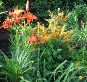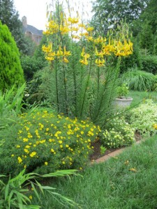 The yellow tiger lilies that started in May have grown tall and have coreopsis ‘Zagreb’ growing at their feet.