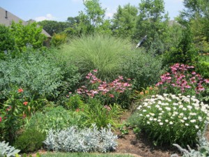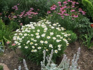 The grass Miscanthus ‘Morning Light’ echoes the mound formation and color of white daisies and creates a background for pink coneflowers.