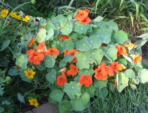 The annual nasturtium, a cool weather plant, was new to the garden this year. I grew them from seed and love the vivid orange color that picks up the color of ‘Grand Paradiso’.