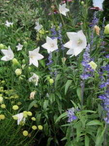 A white platycodon that I have cut back to prevent floppiness has managed to be more beautiful than ever with Salvia ‘Victoria’.