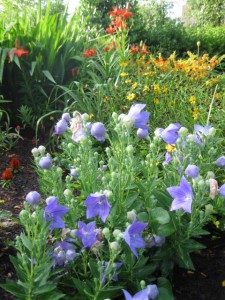 The blue of Platycodon, balloon flower, cool down the hot colors of this border,