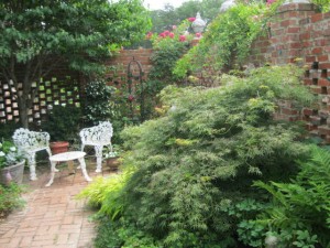 One rose forgot about the break and has been blooming none stop since May. Some of its branches have hopped the wall into the secret garden
