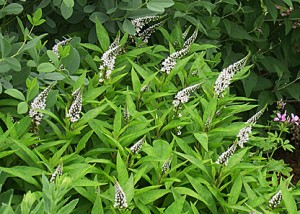 Gooseneck loosestrife (Lysimachia clethroides) never fails to entertain and amuse me. It is a garden thug but I forgive it for its gregarious nature.