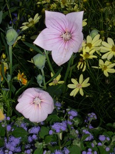 The pink balloon flowers (Platycodon grandiflora), lemon yellow threadleaf coreopsis (Coreopsis verticillata ‘Moonbean’) and blue annual flossflower (Ageratum houstonianum) form an accidental combination I like.