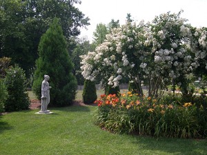 This has been daylily (Hemerocallis spp.) week. The early ones are on the wane but all the others are blooming their heads off and giving a glorious display. The ones in the allee are complemented by the abundant white billowing blooms of the crepe myrtle (Lagerstroemia indica) that contain a bit of yellow in their centers.