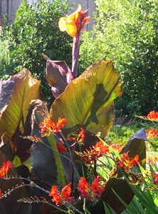 The scarlet of the crocosmia also look smashing against the dark maroon leaves of canna (Canna x generalis ‘Wyoming’).