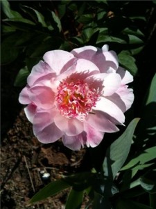 The first peony, ‘Do Tell’, has bloomed. It is one of my newest additions; I planted six roots of ‘Do Tell’ last fall as a backdrop for some of the new irises. They have all come up and have produced buds (and the one flower) considerably earlier the older peonies near by.