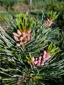 You may think pine trees look the same all year but a close look at this Japanese white pine may change your mind. Some branchs bear clusters of small pollen cones.