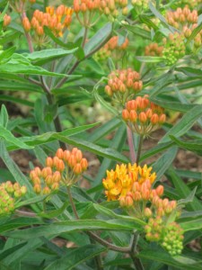 The flowers of butterflyweed blend yellow with orange touched with green.