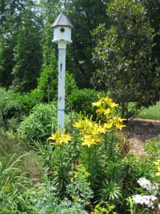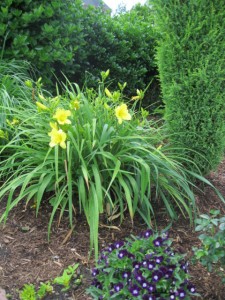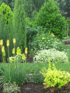 In a neighboring parterre, yellow poker, golden spirea and Stella d’oro daylilies picked up the yellow color.