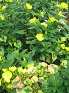 Sundrops bloom in profusion with Houttuynia ‘Chameleon’ at its feet.