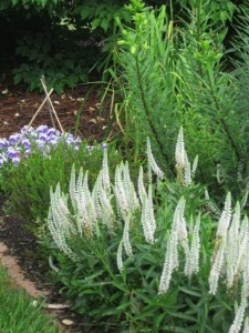 Fuzzy white spikes of Veronica bloom in the white bed.