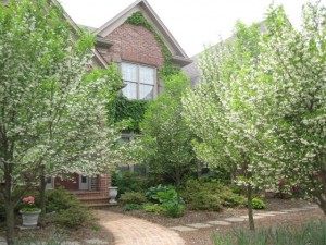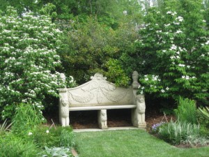 The kousa dogwoods frame the bench in the formal garden.