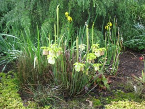 The unusual flowers and leaves of the pitcher plants give a unique look to the bog garden.