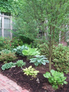 The hostas are filling in the bed with their various shades of green, chartreuse, yellow and white.