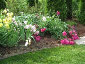 The large heads of peonies bloomed but without cages they flopped on the ground. The head gardener is going to get out the welding equipment and correct the problem for next year.